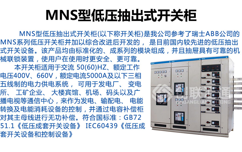 MNS型低壓抽出式開(kāi)關(guān)柜是江蘇爾悅電力設(shè)備有限公司根據(jù)市場(chǎng)需求而開(kāi)發(fā)的新一代低壓開(kāi)關(guān)柜。該產(chǎn)品技術(shù)標(biāo)準(zhǔn)符合IEC439《低壓成套開(kāi)關(guān)設(shè)備和控制設(shè)備》GB7251《低壓成套開(kāi)關(guān)設(shè)備》等標(biāo)準(zhǔn)要求.。