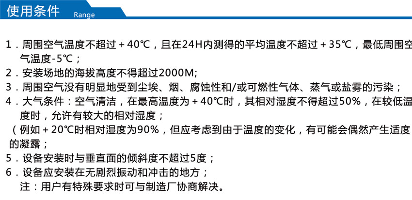 2. 大氣條件:空氣清潔,相對(duì)濕度在最高溫度+40℃時(shí)不超過(guò)50﹪;在較低溫度時(shí)允許有較高的相對(duì)濕度,例如20℃時(shí)為90﹪,但應(yīng)考慮到由于溫度的變化,有可能會(huì)偶然地產(chǎn)生適度的凝露。