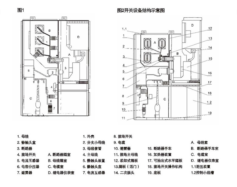 柜體分為手車室、母線室、電纜室、繼電器及儀表室。手車室后部裝有接地的金屬活門,手車抽出后,活門自動關閉;二次觸頭,隨手車進出實現通、斷;母線室與其它室隔開;電纜室位于后下部,便于敷設進出線電纜,底部裝有接地母線;繼電器及儀表室位于柜的前上部。