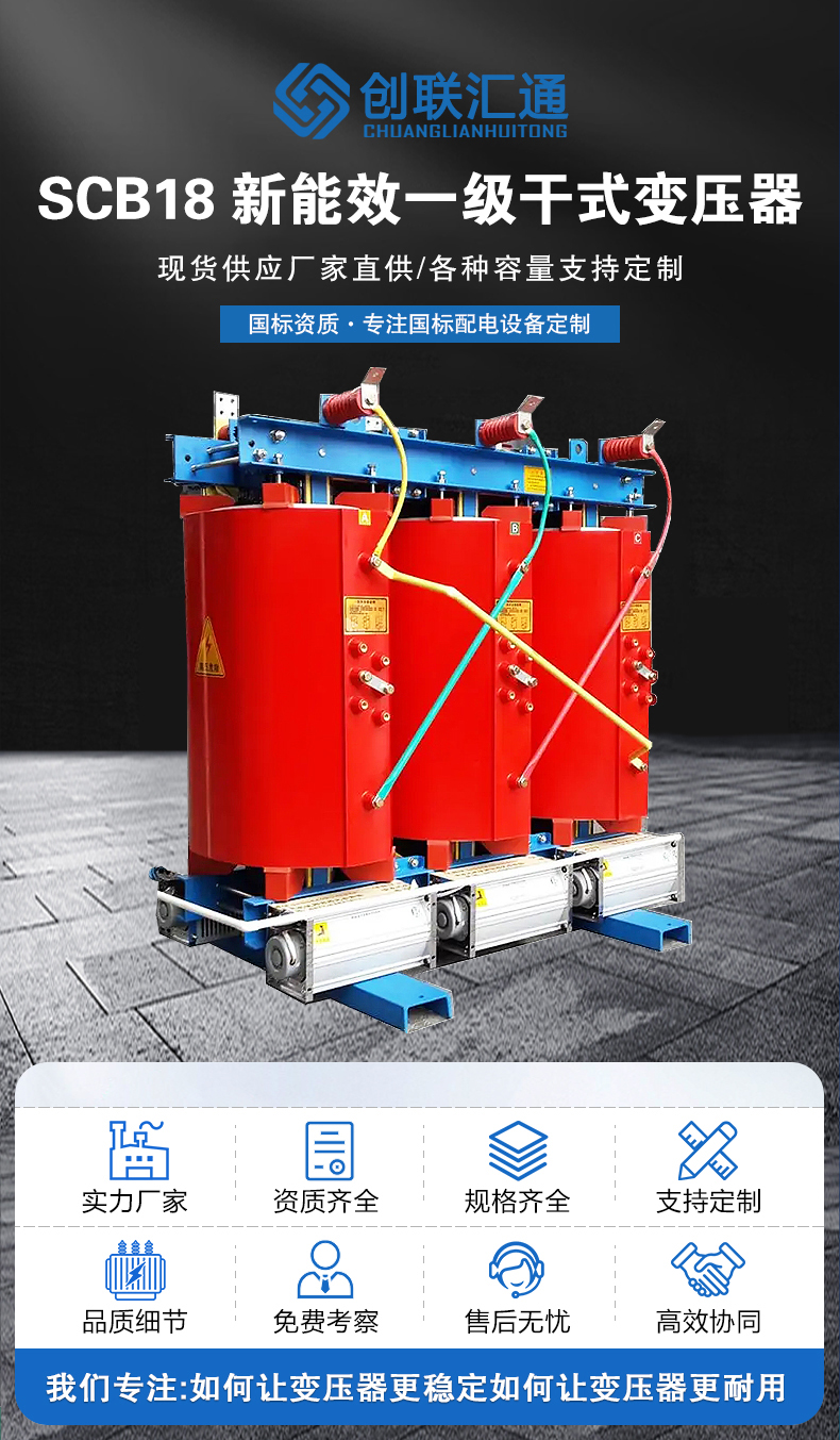 SCB18干式變壓器中SCB代表的參數(shù)和意義:S為三相,C為環(huán)氧樹脂澆注干式變壓器,B是變壓器線圈為銅箔材料繞制,18是指18系列變壓器產(chǎn)品,指電力變壓器性能序列水平代號。