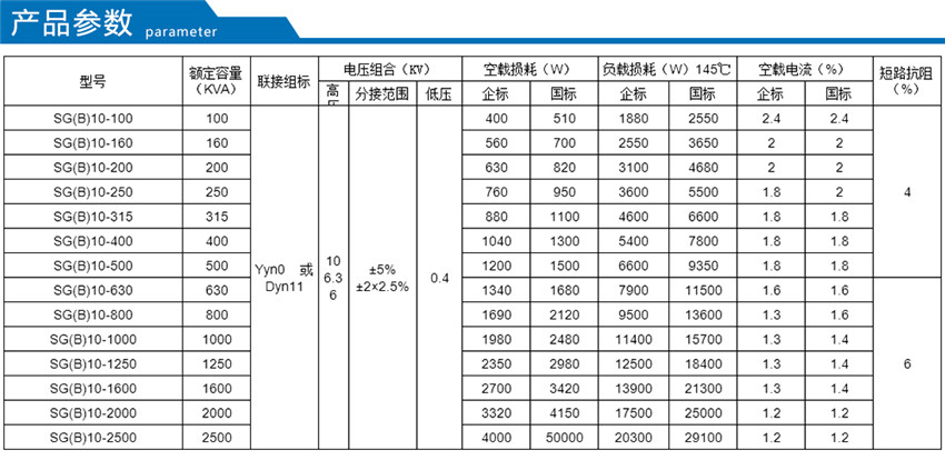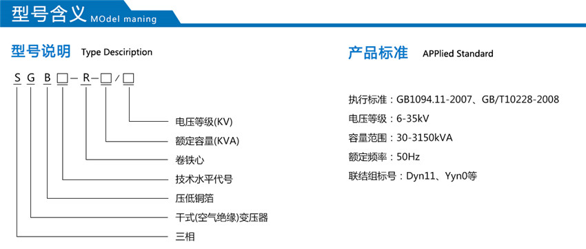 產(chǎn)品型式為H級(jí)、戶內(nèi)、三相、雙繞組、非包封型(SGB)節(jié)能型干式變壓器
