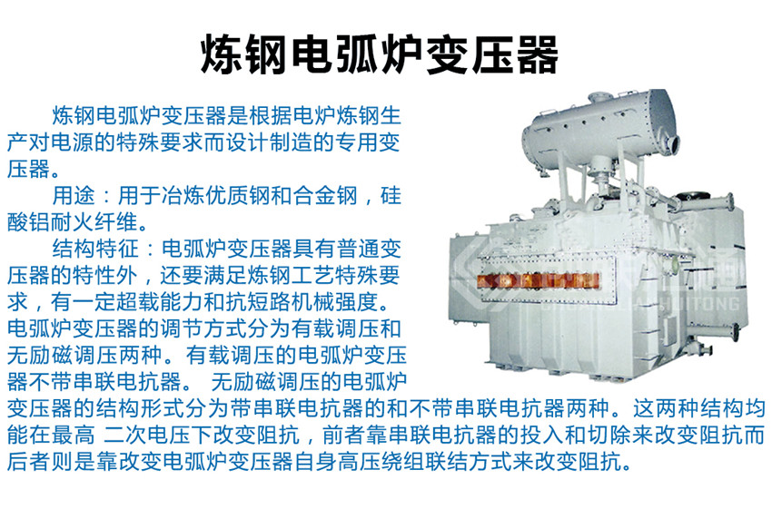 電弧爐變壓器具有普通變壓器的特性外,還要滿足煉鋼工藝特殊要求,有一定超載能力和抗短路機械強度。電弧爐變壓器的調節方式分為有載調壓和無勵磁調壓兩種。有載調壓的電弧爐變壓器不帶串聯電抗器。 無勵磁調壓的電弧爐變壓器的結構形式分為帶串聯電抗器的和不帶串聯電抗器兩種。這兩種結構均能在高 二次電壓下改變阻抗,前者靠串聯電抗器的投入和切除來改變阻抗,而后者則是靠改變電弧爐變壓器自身高 壓繞組聯結方式來改變阻抗。