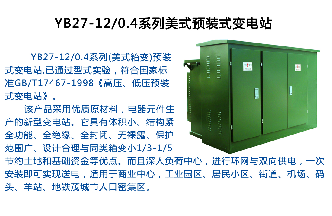 首頁>>產品中心>>箱式變電站YB27-12-0.4系列美式預裝式變電站廠家