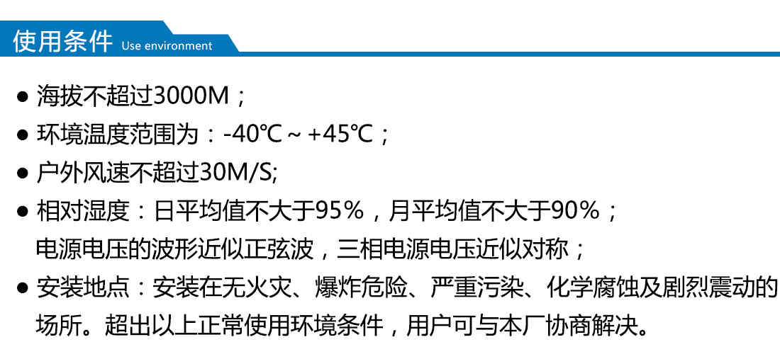 適用于自然條件比較惡劣的海灘、草原、荒漠等無火災、無嚴重污染、無化學腐蝕介質和粉塵、無爆炸性危險運行環境,可用于戶外、又可用于戶內。