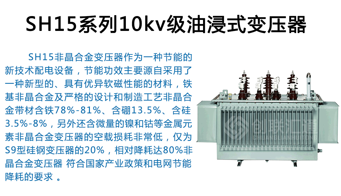 SH15非晶合金變壓器作為一種新一代節(jié)能產(chǎn)品,可以普遍適用于住宅小區(qū)、學(xué)校、工礦企事業(yè)單位以及社會公共設(shè)施。可在戶內(nèi)(外)使用,容量在315kVA 及以下時可安裝在桿上,海拔高度不超過1000m。